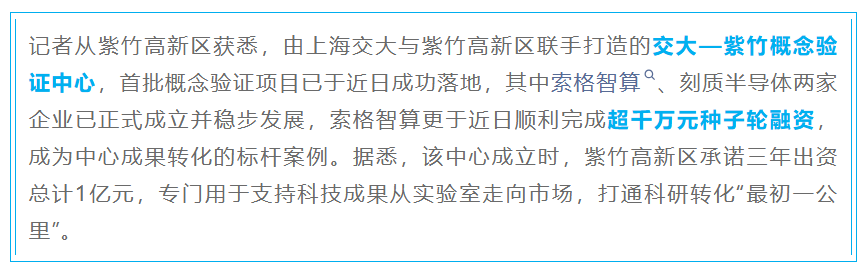 2025年2月24日,上海交通大学与紫竹高新区正式签署合作协议,紫竹高新区明确提出,三年内向上海交大提供总计1亿元经费,专项支持概念验证中心建设,吸引和培育高潜力创新企业。
